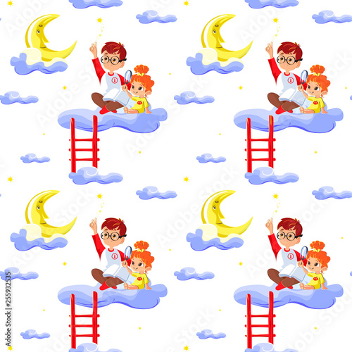 A patterned wallpaper featuring a whimsical illustration of a child and an adult on a red slide, surrounded by clouds, stars, and bananas. The child is wearing a yellow shirt and the adult is wearing a white shirt with a red tie. The scene is repeated multiple times across the wallpaper. | fototapeta na \xc5\x9bcian\xc4\x99 Seamless children pattern with cute boy and little girl, clouds, stars and moon. Creative kids texture for fabric, wrapping, textile, wallpaper, apparel. Concept of children's learning. | c8bfec7b5c062cde4a45f395178ba476b84fe0da2db842af73c3b4bb9084a6b7 | 000910712811 | 0 | 0 | 51 | 29 | 0 | 0 | |