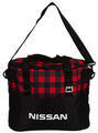 A red and black plaid tote bag with a black strap and a silver buckle is displayed against a white background. The bag has a large front pocket with a zipper closure and a smaller side pocket. The brand name 'Nissan' is embroidered in white on the front of the bag. | Nissan Plaid Cooler Bag | 788c4ede6fcbe6b3e06c09efa7b77dfd47b36fb10e89d0a0bf9e6ebbe8701a0b | 000910713440 | 0 | 0 | 51 | 4 | 0 | 0 | |