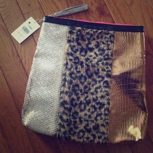 A silver and gold leopard print purse with a black trim is lying on a wooden floor. Next to it, there is a white tag with black text. | Nicki Minaj Clutches & Wallets - Nicki Minaj Accessory Makeup Bag NWT | 136472f76da31db8eccb2a29891878d7fab6ecdd730c757534d6a22800899148 | 000910713456 | 0 | 0 | 28 | 12 | 0 | 0 | |