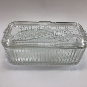 A clear glass casserole dish with a decorative pattern on the lid is placed on a white surface. The dish has a ribbed texture and is empty. | Ribbed Glass Rectangle Retro Country Farmhouse Kitchen Decor Vintage Refrigerator Dish Lidded Fruit Theme Top | 4b38a2266ba900f25aac8c3135b828d4d484ce3c661d8ae2bd9f58817d55cb60 | 000910713321 | 0 | 0 | 27 | 15 | 0 | 0 | |