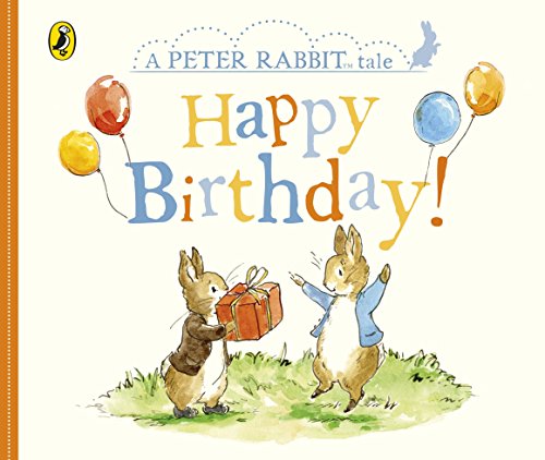 The second image is a children's book illustration titled 'A Peter Rabbit Tale: Happy Birthday!' featuring two anthropomorphic rabbits, one holding a gift, and the other holding a bunch of balloons. The rabbits are standing on grass, and the background is a simple, colorful design. The image is framed with a border tha... | Peter Rabbit Tales \xe2\x80\x93 Happy Birthday | 423197e935db71e3bd4ff42bef3d2e2297c6cbf1a4ccae7ce1894cc8bdba8cac | 000910713428 | 0 | 0 | 70 | 6 | 0 | 0 | |