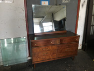 A vintage wooden dresser with a large mirror on top is placed against a wall with a window. The dresser has a dark wood finish and is adorned with brass handles. The mirror reflects the room, showing a window with white frames and a dark wooden floor. The wall has a few patches of paint and a sign with the word 'IBM' o... | MCM Walnut 6 Drawer Dresser w/ Mirror | 2fbff73a53d2a292a8d6d16cdee9b8af4cdd64a07c45017c1ee71dfc01ba5efb | 000910713797 | 0 | 0 | 64 | 7 | 0 | 0 | |