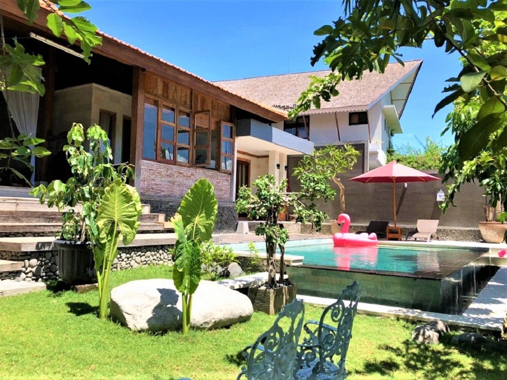 A serene backyard scene with a large swimming pool surrounded by lush greenery and tropical plants. A pink flamingo float is resting on the pool's surface. The area is adorned with various potted plants, a stone pathway, and a wooden deck with a red umbrella providing shade. In the background, a traditional house with ... | Brand new four bedroom joglo style villa For Yearly Rental | f616816e38371ad69a69ecd422b936177e73b0e72f1cb42cdd26bc4714f54bc4 | 000910713749 | 0 | 0 | 62 | 10 | 0 | 0 | |