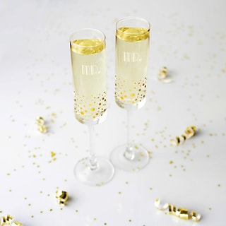 Two clear wine glasses filled with champagne are placed on a white surface. The glasses have gold lettering on the side that reads 'CHAMPAGNE'. The surface is scattered with gold confetti and gold coins. | Mr. & Mr. 8 oz. Gatsby Gold Dotted Contemporary Champagne Flutes | bda7aed8e08df5ea0f521d278810c4d33b319a8fd3246c5a1cc0cebb1f3ebe06 | 000910714308 | 0 | 0 | 34 | 11 | 0 | 0 | |