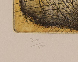 A close-up of a textured surface resembling a piece of paper with a pencil drawing of a circle and a number '30' written in the bottom left corner. The drawing is in a monochromatic brown tone, and the paper has a grid pattern with vertical and horizontal lines. | Sandro chia, etsching in colours and aquatint, 1985, 30/50. | c09e2c8669cc4dc1279f7ef5beb7d5e379b7b5d78a12211c0fd97afcf8dc2f9c | 000910714264 | 0 | 0 | 48 | 9 | 0 | 0 | |