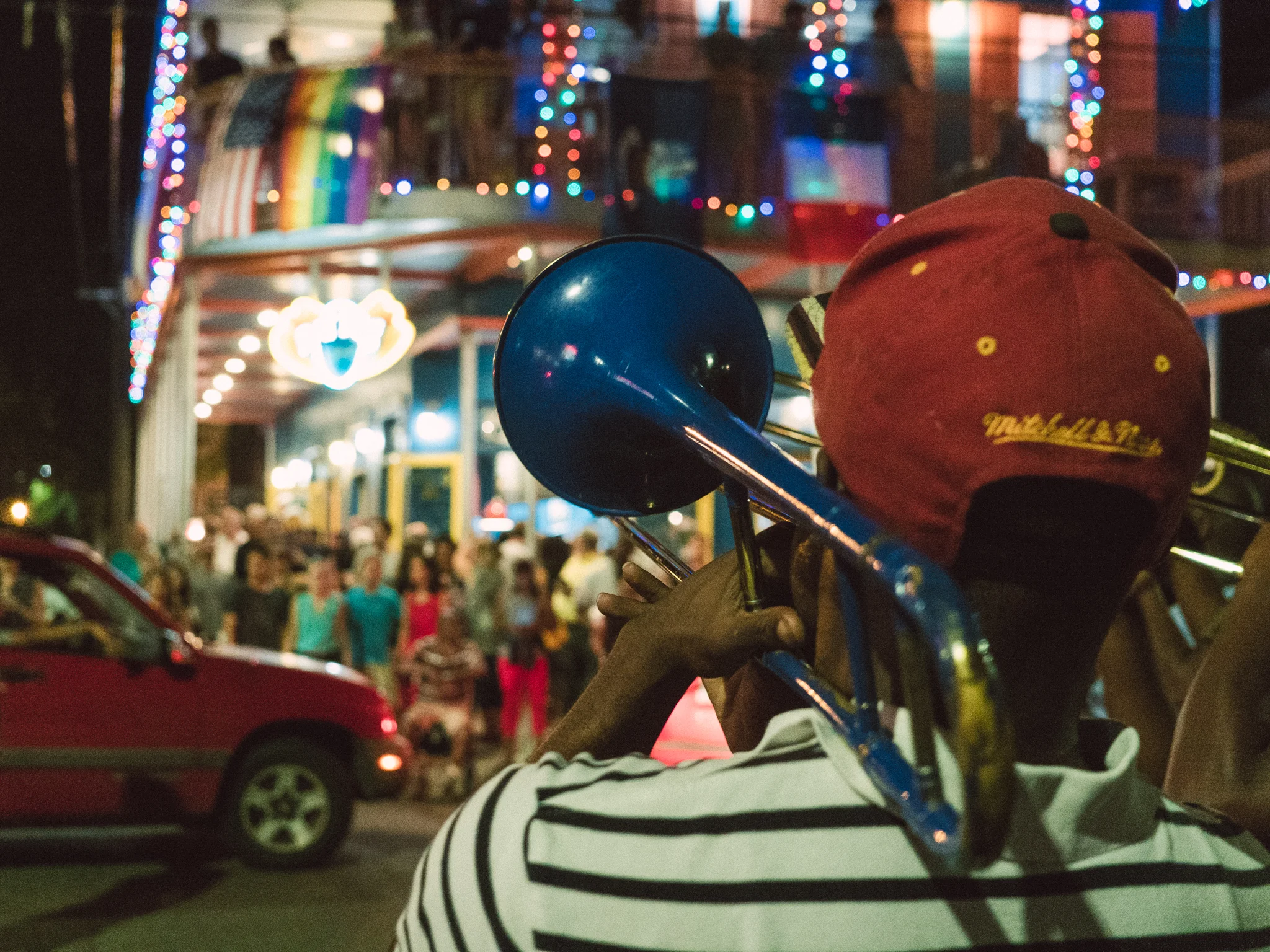 A person is playing a trumpet on a street at night, surrounded by a crowd of people. The scene is illuminated by colorful lights and decorations, including a rainbow flag and festive lights on the buildings. A red car is visible in the background, and the person playing the trumpet is wearing a red baseball cap. | A musician playing on Frenchmen Street. | 9015344d398d0057c053ebbf91c17e93c8a2f99868d19f16d7c542df0ba3078f | 000910714319 | 0 | 0 | 56 | 6 | 0 | 0 | |