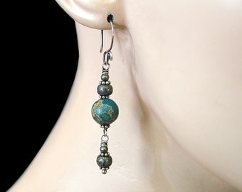 A close-up of a person's ear with a detailed view of the earlobe and the top of the ear. The earlobe is adorned with a large, round, green and blue stone earring with a silver chain and a smaller, round, green stone earring with a silver chain. The top of the ear shows the beginning of the ear canal and the helix of th... | FREE SHIPPING---Aqua Terra Jasper Pyrite Long Dangle Earrings---Sterling Silver---Creations by Sandy | 114cc9819ff030a134ee7e9de276188eaddc1e457b35c70bf6a19d4ff88a9f44 | 000910714246 | 0 | 0 | 65 | 11 | 0 | 0 | |