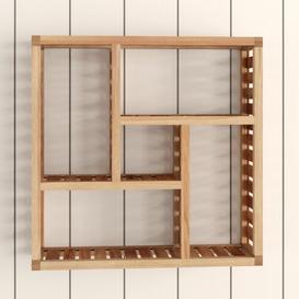 A wooden shelf with a geometric design, featuring a series of horizontal and vertical slats, is mounted on a white wall. The shelf has a total of nine compartments, with three rows of three compartments each. The compartments are empty, and the shelf is set against a white background with horizontal lines. | image-Avelar 50 x 50cm Bathroom Shelf | dff3484bf580a1051155d841228c4bfe74494556b07da8aa35bd592619753543 | 000910714251 | 0 | 0 | 52 | 6 | 0 | 0 | |