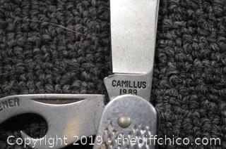 A close-up of a silver pocket knife with a textured handle, featuring a blade with the name 'Camilus' engraved on it. The knife is lying on a dark fabric surface with a visible thread running through it. | Camillus Folding Knife | 66978afcebf47f01a8efcdaa7ab09f382b3c89e9c723095906268f24ce9acd8e | 000910714541 | 0 | 0 | 37 | 3 | 0 | 0 | |