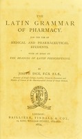 A yellowed, aged book cover with the title 'The Latin Grammar of Pharmacy' in a decorative font. The cover features a circular emblem with a cross and the initials 'J. E.' in the center. The book is attributed to Joseph Ennever, F.C.A. and F.R.C.S. The publisher's name is not visible, but the book is described as being... | view The Latin grammar of pharmacy for the use of medical and pharmaceutical students with an essay on the reading of Latin prescriptions. | 35e23361f7b85b0a2fbf52f1e2b8a98fc2491341b6f8a71fdd7ee652c263b6e4 | 000910714567 | 0 | 0 | 60 | 23 | 0 | 0 | |