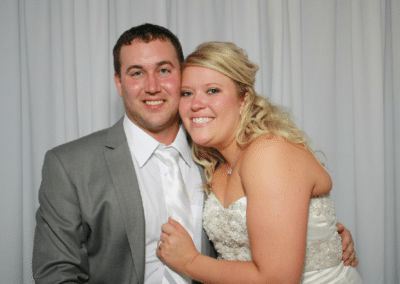 A man and a woman are standing close together, smiling at the camera. The man is wearing a gray suit and the woman is wearing a white wedding dress with a lace top. They are both holding each other's arms, and the woman is wearing a diamond necklace. The background is a plain, light-colored wall. | September 29, 2012 Abby & Mike | c4edaffd1297b08816f34579d51be9d356f62ec285ece93cfc3d41dda970060c | 000910714560 | 0 | 0 | 55 | 6 | 0 | 0 | |