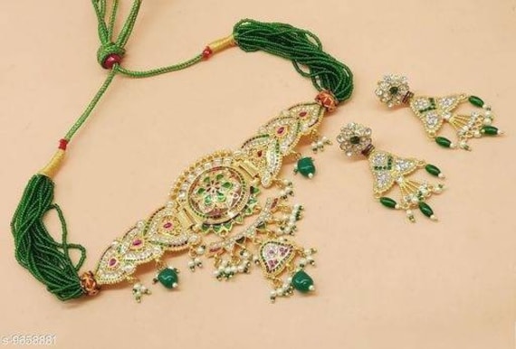 A close-up view of a traditional Indian necklace with intricate gold and green designs, featuring a large circular pendant and multiple smaller pendants, all adorned with green gemstones and gold accents. The necklace is set against a plain background. | Details about \xc2\xa0Indian Rajasthani Boho Kundan set with Pearl & Crystal Beads Handmade Ball | 6d93778e1c53a9aafb185baa5120a7783b44e17f9e75dc953d84f488f72b7018 | 000910714510 | 0 | 0 | 39 | 14 | 0 | 0 | |