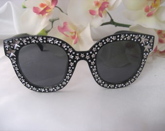 A pair of black sunglasses with a sparkling diamond pattern on the frame is placed on a white surface. The background features a blurred image of white orchids. | 311f1d976d Bling Inspired Rhinestone Silver tone Stars Sunglasses Eyewear Black Frame Accessories | d3c20d11356b453a5e60e1960e9bb7582c33bbee70226e46f1652d9cace96f1e | 000910714550 | 0 | 0 | 28 | 12 | 0 | 0 | |