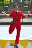 A man in a red jumpsuit with a black belt and a white shirt underneath is performing a split on a stage with a yellow and white checkered floor. He has a black wristwatch on his left wrist and is wearing black shoes. The stage is surrounded by a stone wall with steps leading up to it, and there are trees visible in the background. | Jonathon Burns, World Buskers Festival stock images | c51dc3528695ba1bd762f1fbe0c42b9d278a281bedf14bf8d14cc83208dcbd05 | 000910687814 | 0 | 0 | 65 | 7 | 0 | 0 | |