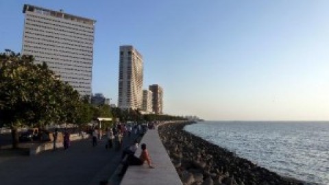 A cityscape with tall buildings and a clear blue sky. The buildings are reflected in the calm waters of the ocean, which is visible in the foreground. There is a promenade with people walking along it, and the ocean is bordered by a rocky shoreline. | Mumbai Calling: 5 Things You Ought To Experience In Mumbai! | f0966b4b2ab8521aa1c275697031662b8e591e9bf3ce30e24b8b7470b421d261 | 000910687772 | 0 | 0 | 45 | 10 | 0 | 0 | |