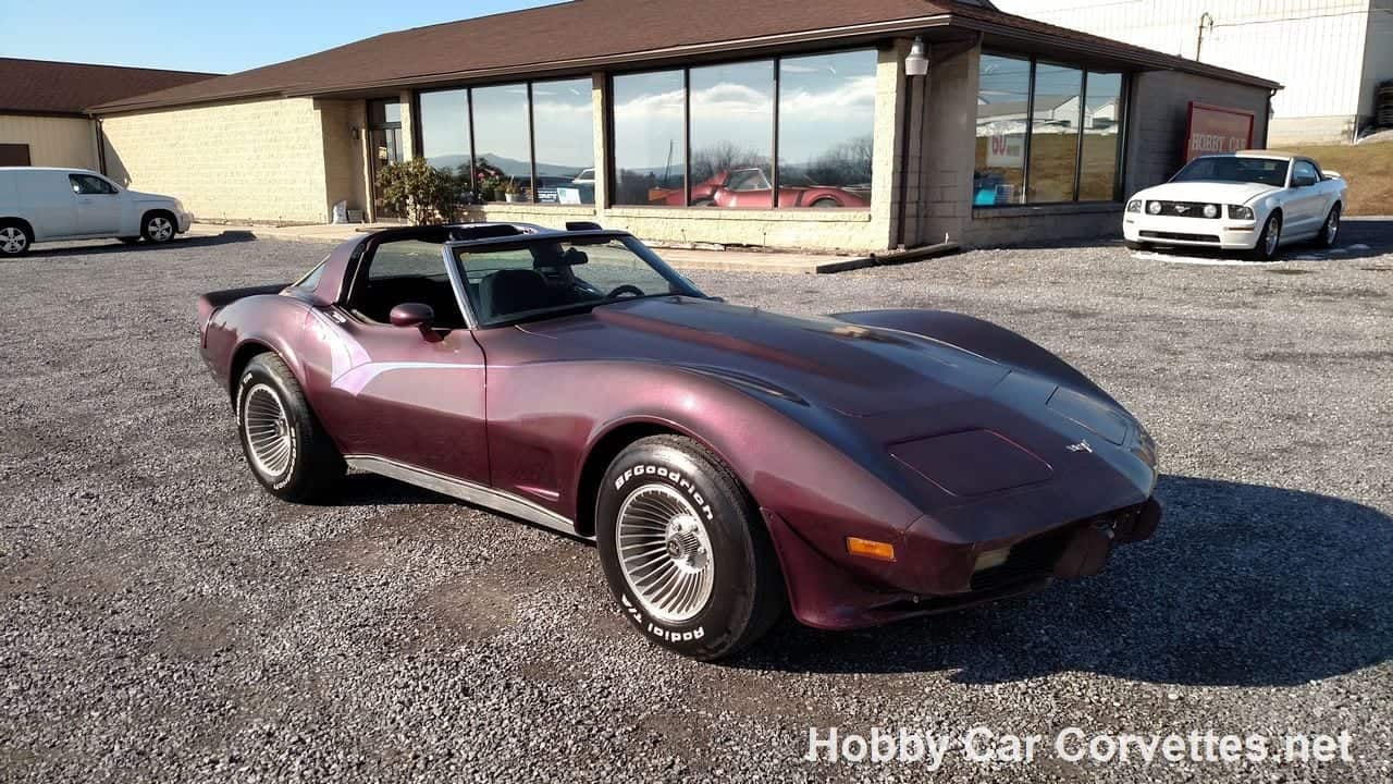 A purple convertible sports car is parked in front of a building with a red roof. The car has a sleek design with a closed top and is positioned on a gravel surface. In the background, there are two other cars, one white and one red, and a building with large windows. | 1979 Black Cherry Corvette T Top For Sale | c6b94ad186f6ada0128993adca164b3fbccca09f3e15297672d5d4158295e30e | 000910687862 | 0 | 0 | 52 | 8 | 0 | 0 | |