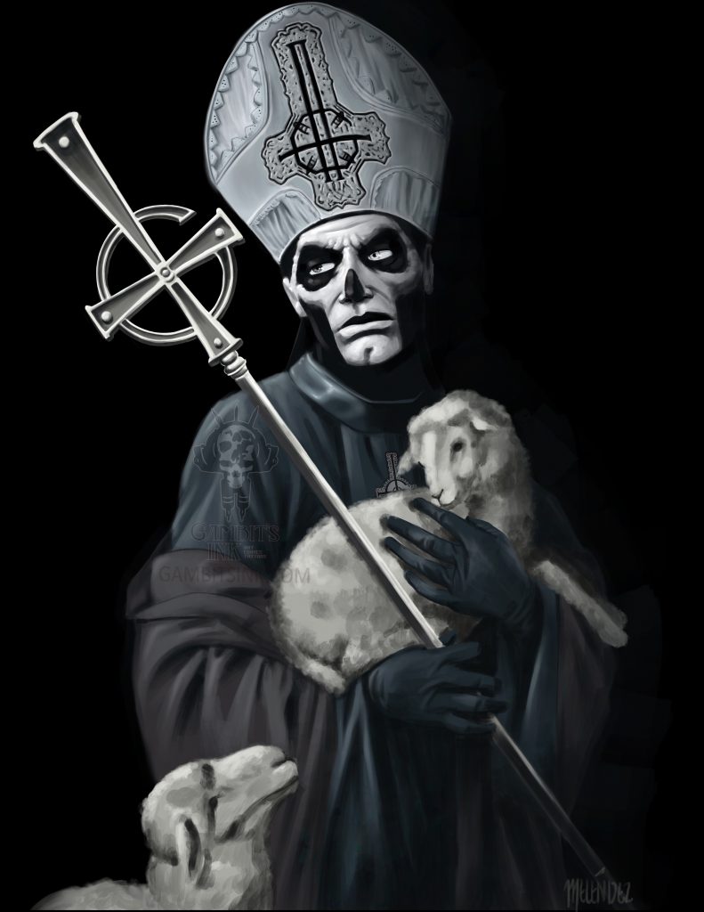 A monochromatic image featuring a figure in a dark robe and a white mitre, holding a staff with a cross on top. The figure is surrounded by three sheep, one in the foreground and two in the background. The background is dark, and the overall tone of the image is somber. | Papa Emeritus from the band Ghost holding a lamb. | 3adc43051d7ab8c116b71ab5c05b36e9da4d4236925f9d5963a434154c249c66 | 000910715231 | 0 | 0 | 51 | 9 | 0 | 0 | |