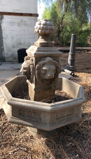 A weathered stone fountain with a lion's head spout sits in a dry, overgrown area with dead grass and weeds. The fountain is surrounded by a concrete basin with intricate designs. There are two stone columns, one on each side of the fountain, and a small tree with sparse foliage in the background. | Two matching lion heads fountains. Made from concrete. Originally $2000 in perfect condition for Sale in Riverside, CA | 807f94c6c203c3f7f8d11f120e0416856cfe2141b0802d5068e1fd62b9936474 | 000910715178 | 0 | 0 | 53 | 18 | 0 | 0 | |