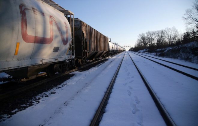 A train is traveling down a snowy track with a clear sky above. The train consists of multiple cars, including a locomotive and several cargo cars. The tracks are surrounded by snow-covered ground, and there are trees in the background. The train's headlights are off, and the scene appears to be during the day. | A CN freight train remains halted as train tracks are blocked two km away at Tyendinaga, Ont., east of Belleville, on Feb. 14, 2020. (Photo: Reuters/Chris Helgren)\n | 861fbbf69f93c4ce500e62f66621009165c2bb92be4139322eec0497607a811f | 000910715288 | 0 | 0 | 54 | 27 | 0 | 0 | |