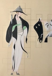 A stylized illustration of a woman in traditional Japanese attire, including a kimono and a conical hat, holding a fan. The background features a grid pattern with a beige color. | Haute Couture High Dress 1987 Limited Edition Print by Erte | 5c2598efb4ad2462acf58ac209aa4963ffddfa1ec9ca2fb25bf760f1e28a7701 | 000910715598 | 0 | 0 | 30 | 10 | 0 | 0 | |