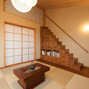 A traditional Japanese room with tatami flooring, a low wooden table with a teapot and cups, a bookshelf filled with books, and a wooden staircase leading to a loft area. | Inspiration for an asian open concept tatami floor living room remodel in Kyoto with beige walls | d9a0d4194b6ff8203910a99f576f28990c257465558ed250f764a72e5c16e7e8 | 000910715580 | 0 | 0 | 30 | 16 | 0 | 0 | |