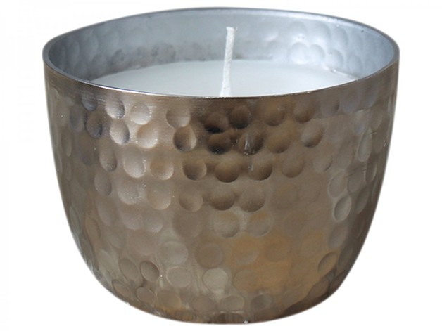 A silver candle holder with a textured surface and a lit candle inside is placed against a white background. | LaVida: Candle - French Pear | 15662bf31d02228e5390cf3d5a16d4e6483f397ee9166969df5aaff74d4ddb7d | 000910715895 | 0 | 0 | 19 | 5 | 0 | 0 | |