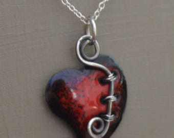 A silver necklace with a heart-shaped pendant featuring a red and black marbled pattern and a twisted metal design on the heart's border. | Enameled Red and Black Heart Pendant | 4b1ca5b62e3a4f4845564053d60eee7140ec3bfdf98bdec1e88d59c5c250d946 | 000910715824 | 0 | 0 | 23 | 6 | 0 | 0 | |