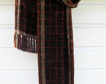 A plaid scarf with a fringed tassel is draped over a white wooden surface. The scarf has a mix of red, brown, and beige colors, creating a warm and cozy pattern. The tassel is long and hangs down, adding a decorative element to the scarf. | Handwoven Rayon Chenille Scarf-Made to Order | a54768ebc50659333be9f723dff5530ba1f389a004e5a82251d21a2ce97e8f82 | 000910715884 | 0 | 0 | 45 | 6 | 0 | 0 | |