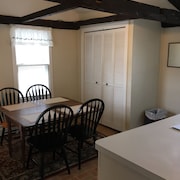 A cozy dining room with a wooden table surrounded by four wooden chairs. The table has a white tablecloth and a few papers on it. The room has a white door with a window above it, and a white cabinet with a window above it. There is a white trash can in the corner, and the floor is covered with a patterned rug. | Private Kitchen | 106b47fc0168571a654cf47761329eebd6c650bcac557fca782fdb309cd8822d | 000910716213 | 0 | 0 | 63 | 2 | 0 | 0 | |