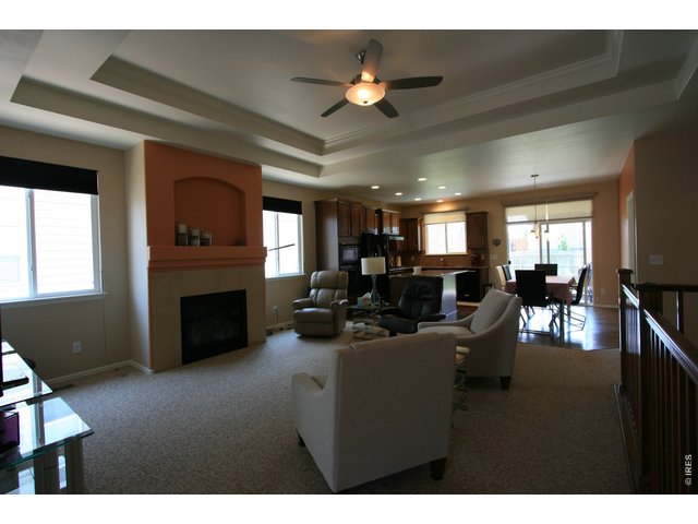 A spacious living room with a beige sofa, a white armchair, and a glass coffee table. The room has a large window with black curtains, a fireplace, and a ceiling fan. There is a dining area with a table and chairs, and a kitchen with cabinets and a refrigerator. The floor is carpeted, and there is a wooden staircase le... | 7430 E 123rd Ave Thornton, CO 80602 - MLS #: 828754 | d5d9de6994a7a7238d38f9fba056b738e8a1d68929115300d06c2439eb3bea6e | 000910716242 | 0 | 0 | 64 | 11 | 0 | 0 | |