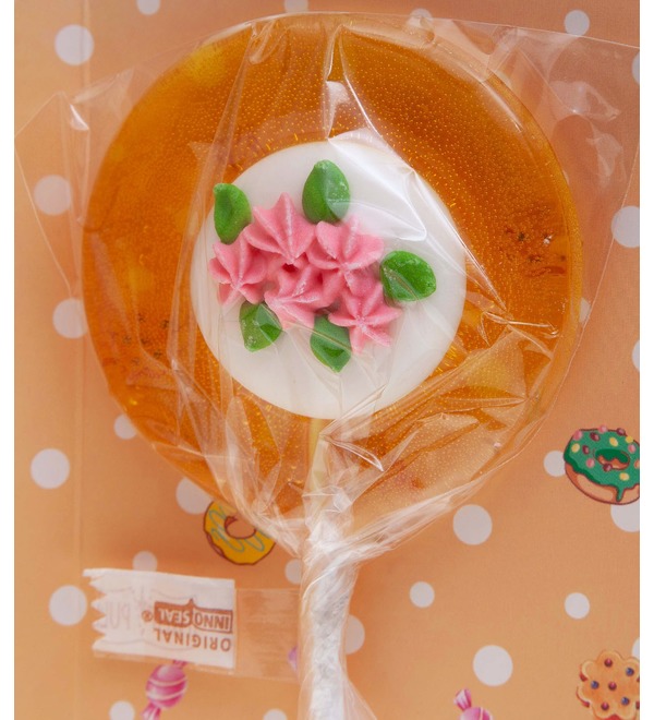 A lollipop with a white base and a pink and green floral design on top is wrapped in clear plastic. The lollipop is placed on a surface with a polka dot pattern, and there are two other lollipops in the background, one with a pink and green floral design and the other with a green and yellow design. | Postcard with lollipop You are my happiness! \xe2\x80\x93 photo #2 | 255ce31d5141461481dbdddb0be2f645d7f8e8fdea578d55b10f48f9acd4efa7 | 000910716089 | 0 | 0 | 58 | 10 | 0 | 0 | |
