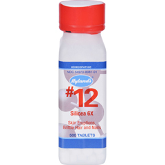 A bottle of clear nail polish with a red cap, labeled 'Nailene #12 Silica X Skin Eruptions, Brittle Hair and Nails, 500 Tablets'. | HGR0131565 - Hyland'sNo 12 Silicea 6X - 500 Tablets | abdfeea8e15cea2fd44abeb1e3824d51011160ff665a3ebd75e6bff8a8965c63 | 000910716508 | 0 | 0 | 23 | 9 | 0 | 0 | |