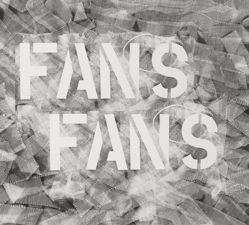 The second image is a close-up of the word 'FANS' with the letters 'F', 'A', 'N', and 'S' prominently displayed. The letters are in a bold, white font against a textured, dark background that resembles a mosaic or a collage of small, irregular shapes. The word 'FANS' is centered in the image, and the background has a m... | Fans Fans, Archival print on paper, 26" W x 24" H, 2016 | 4ae25893779e3e8f6700c540097a702d6a61e8fda3541cd091e6a422857bf14f | 000910716498 | 0 | 0 | 67 | 12 | 0 | 0 | |