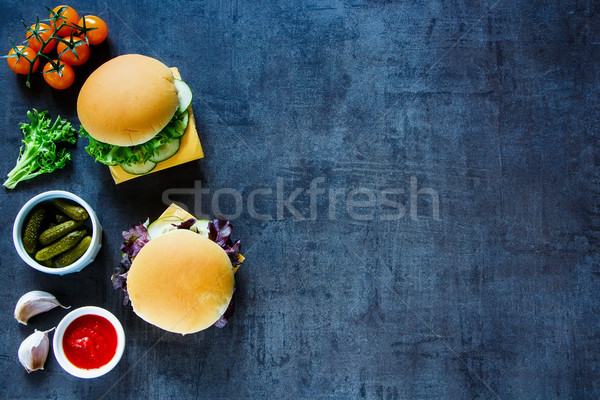 A gourmet burger with lettuce, tomato, cheese, and a slice of pickle on a sesame seed bun is placed on a dark surface. Accompanying the burger are a bowl of pickles, a bowl of ketchup, a whole tomato, a clove of garlic, and a sprig of parsley. The word'stockfresh' is written in the bottom right corner of the image. | Cheese sandwich with vegetables Stock photo \xc2\xa9 YuliyaGontar | f52ff8faa5112d4c8c41973ce660074f4a7bb903d5b5f72c0e934102f6d5f246 | 000910716574 | 0 | 0 | 59 | 8 | 0 | 0 | |