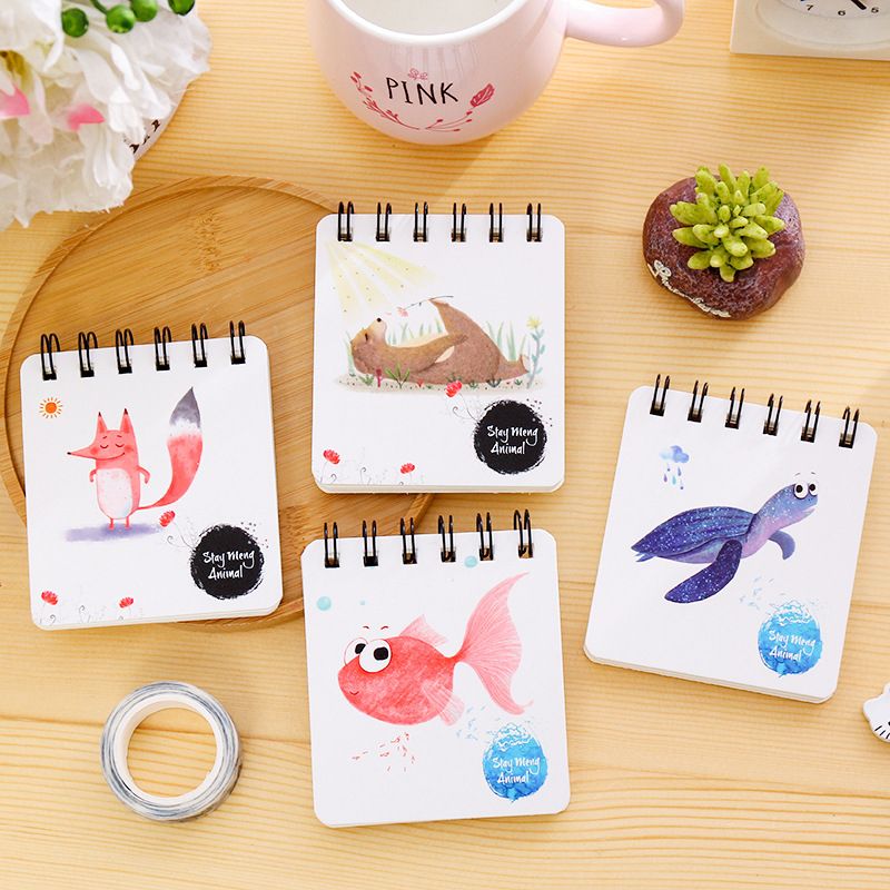 A set of four colorful notepads with animal designs is arranged on a wooden surface. Each notepad has a different animal design: a red fish, a brown bear, a blue fish, and a red fox. The notepads are placed next to a pink mug with the word 'PINK' written on it, and a small potted plant with green leaves. There is also ... | Cute Kawaii Flower Coil Sketching Book Cartoon Animal Notebook For Kids Paint Draw Stationery | b53c018e3d614ef39c2f99c08d6bc36ff515d8d747217c05064a93fd307896c0 | 000910716521 | 0 | 0 | 75 | 14 | 0 | 0 | |