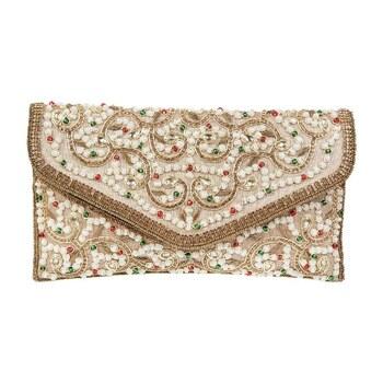 A white handbag with a gold trim and a floral pattern on the front is displayed against a white background. | Metro Antique-Gold Womens Bags Envelope Clutch | 8953b993cd3364d60ab230896e0eb5b6cef37df01689731f4cf8e7832761ff02 | 000910716677 | 0 | 0 | 20 | 6 | 0 | 0 | |