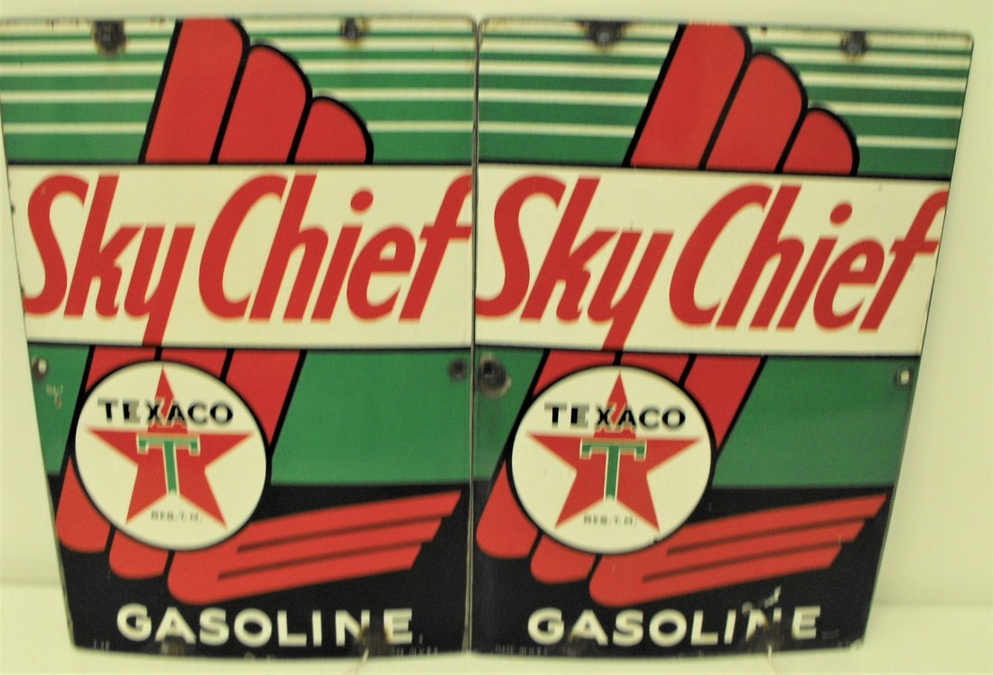 A vintage advertisement featuring two red and white gasoline pumps with the brand name 'Sky Chief' and the slogan 'Sky Chief Gasoline'. The pumps are depicted with a stylized illustration of a hand holding a gas pump nozzle. The background is a plain white color, and the advertisement has a retro aesthetic. | Pair Porcelain Sky Chief Texaco Pump Plates Signs | cb14c0698cb3b19dcf35e0241c57ac8cf53b154e2b0ebd665ef9805bb2338900 | 000910716841 | 0 | 0 | 52 | 8 | 0 | 0 | |