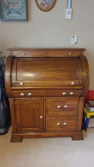 A vintage wooden dresser with a curved top and three drawers is placed against a wall with a framed picture above it. The dresser has a dark wood finish and is adorned with brass knobs. There is a small blue and yellow toy car on the floor to the right of the dresser. | Solid oak roll top desk. Perfect condition. for Sale in Lake Stevens, WA | 6b0b851eb6e99e44fbea0a609a9afa3254822a5f14dd75dcfb03a9598e63c717 | 000910716697 | 0 | 0 | 53 | 13 | 0 | 0 | |