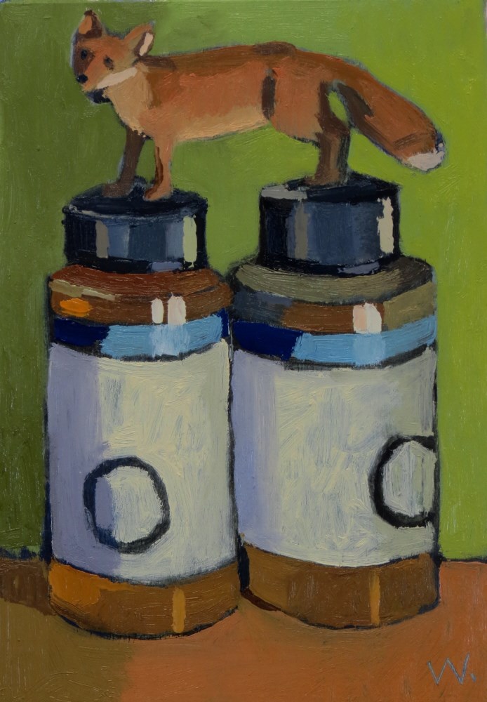 A painting of two jars with a fox figurine on top of each. The jars are on a surface with a green background. The left jar has a blue label with a white circle and a white label with a black circle. The right jar has a blue label with a white circle and a white label with a black circle. The fox figurine on the left ja... | "Fox Hunting" original fine art by Joan Wiberg | 86c07d3ff402205f6013f1adfb01b1eca488ba5ef398818e4eccabe0b86e0d6a | 000910716710 | 0 | 0 | 96 | 8 | 0 | 0 | |
