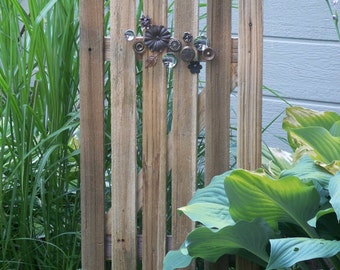 A rustic wooden fence with a metal gate, adorned with various metal objects such as gears, nuts, and bolts, is surrounded by lush greenery and plants. | Pretty Garden Gate Decor, Natural Cedar Fence With Knob Bouquet, Garden Gate Style Decor | 599a8a535c634a7bd71fc4343261039943e9ddb2493629c4f66b81d2b99b6530 | 000910716924 | 0 | 0 | 26 | 14 | 0 | 0 | |