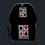 A black backpack with a large, detailed image of a deck of cards on the back. The cards are arranged in a way that resembles a poker hand, with the four of clubs, five of diamonds, seven of spades, and eight of hearts prominently displayed. The word 'CHIMBAGA' is written in a stylized font below the card design. The ba... | Cribbage Player custom messenger bag<br><div class="desc">A great gift for a Cribbage player! Add your own text, such as your name, if you wish. See my store for more items with this design.</div> | 44f771564d2cc5ffbb2de0b6153f12f12e77cc06caa4169c7e403f77ee7afd2c | 000910716865 | 0 | 0 | 75 | 32 | 0 | 0 | |