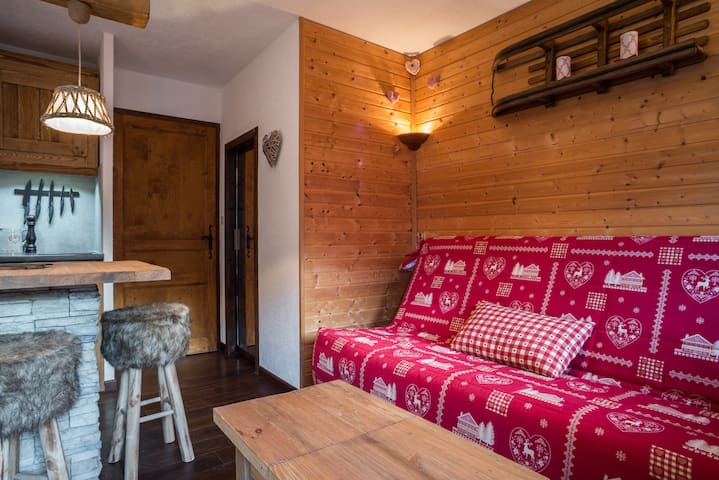 A cozy cabin interior with a red sofa adorned with a checkered pattern, a wooden coffee table, and a fur-covered stool. The walls are made of wooden planks, and there is a wooden shelf with decorative items. A pendant light hangs from the ceiling, and a wooden door is partially open, revealing a dark hallway. | Studio Cosy Les Montagnys - Ch\xc3\xa2tel - Apartment | 39f5d3075961af3f777762e2f23554126ce35af709aa44fcc665a4f57ed096f5 | 000910717206 | 0 | 0 | 55 | 8 | 0 | 0 | |