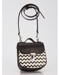 A black leather handbag with a white and black chevron pattern on the front is displayed against a white background. The bag has a long strap and a silver buckle. | Jam Love London - Charlotte Saddle Bag In Ponyskin Mushroom - Sold Out - Lyst | 3609bab52386ed3255459161566c7c9400123c031cddeba7651eae7fc51c9d2c | 000910717232 | 0 | 0 | 30 | 15 | 0 | 0 | |