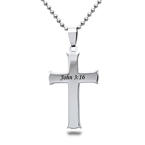 A silver cross pendant with a chain, featuring the text 'JOHN 3:16' engraved on it. | Front Cross Necklace - 3 | d81f06e578d2cf8c505859b796e1d9c3a8d04b265e51aeca730b730e0bf6a5bf | 000910717208 | 0 | 0 | 15 | 5 | 0 | 0 | |