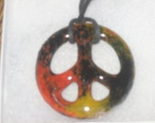 A close-up image of a peace sign pendant with a colorful, multicolored glass design. The pendant is set against a white background, and the glass has a textured, almost marbled appearance with shades of red, yellow, and black. The peace sign is symmetrical with a white outline and a black center, and the pendant is att... | Peace Sign Pendant Fused Glass | 3bbc229640af519daf3b384e7e1a045cab52eeba3fad6af5c210e644af80a1c7 | 000910717310 | 0 | 0 | 60 | 5 | 0 | 0 | |
