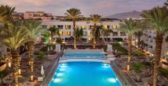 Aerial view of a hotel with a swimming pool surrounded by palm trees and buildings. The pool is illuminated by lights, and there are chairs and umbrellas around it. The hotel has a modern design with large windows and balconies. The sky is clear with a hint of clouds, and there are mountains in the distance. | Leonardo Plaza Hotel Eilat - Eilat - Havuz | b7957e22f5fe259004298155ba1c0541bb0d9bcd4c3402f978974f6f2b2b7e72 | 000910717356 | 0 | 0 | 56 | 8 | 0 | 0 | |