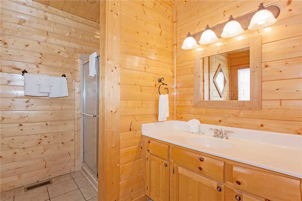 A wooden bathroom with a white sink, a mirror above it, and a towel rack to the left. The walls and floor are made of wood, and there is a window with a diamond-shaped design in the mirror. The lighting is provided by three wall-mounted lamps. | Photo of a Pigeon Forge Cabin named Bear Den Lodge - This is the twelfth photo in the set. | 3e5d1ae02746aae1b09bd7e015cfcabb27c3ce952ec0e90a6981643fd10ee5b9 | 000910717448 | 0 | 0 | 46 | 19 | 0 | 0 | |