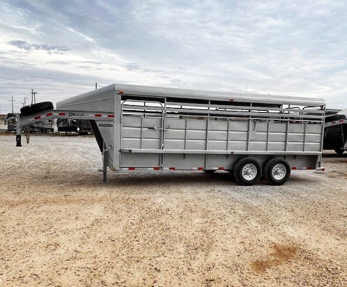 A silver livestock trailer is parked on a dirt ground with a clear sky above. The trailer has a metal fence on the back and is equipped with a ramp on the left side. There are no visible animals inside the trailer. | 2021 Grey 20' Delco Stock Trailer | ab4422fc90ecb1ac28fe4b980bb52bcb14e227b8580d6a7a6a5c081cefedd42e | 000910717516 | 0 | 0 | 42 | 6 | 0 | 0 | |
