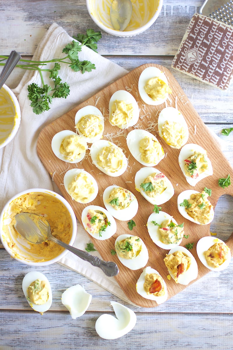 A rustic wooden table is set with a variety of deviled eggs, some with garnishes like chopped herbs and diced vegetables. There are bowls of egg salad and a spoon, a cloth napkin, and a wooden cutting board with deviled eggs. The table also has a book with a recipe on it and a bowl of sauce. | deviled eggs deviled eggs old bay deviled eggs deviled eggs deviled ... | 512e6e298eb149b31fe8e5a20628783d225e98d6ef24127a34734bd854855787 | 000910717462 | 0 | 0 | 57 | 12 | 0 | 0 | |