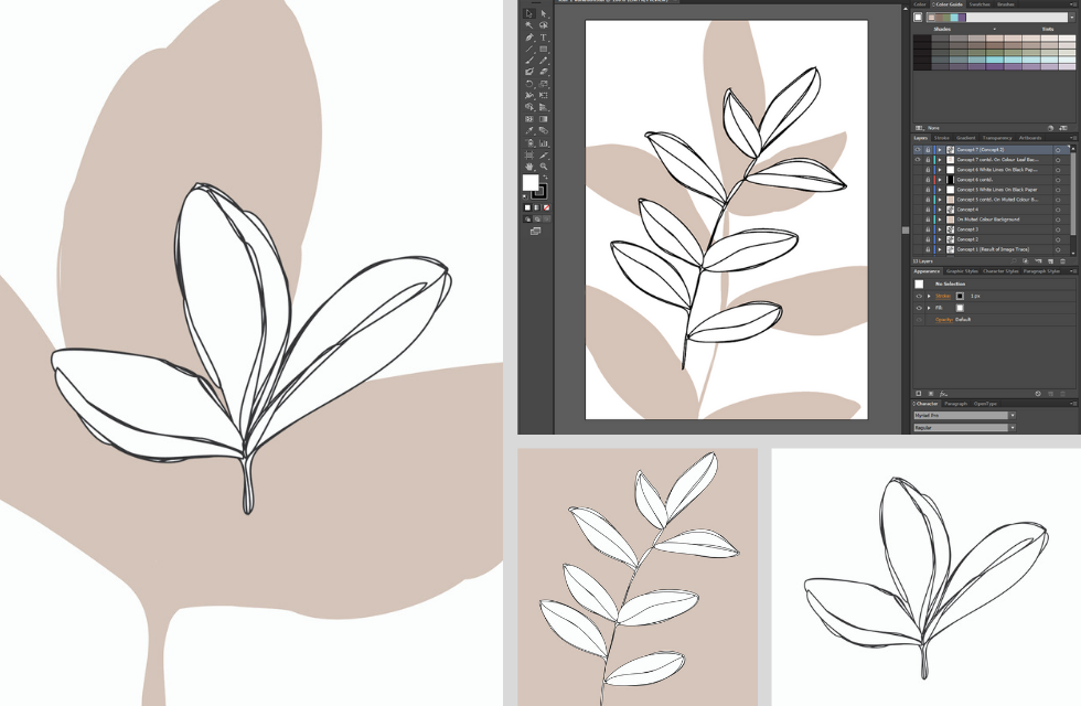 A digital illustration of a leaf with a stylized, hand-drawn appearance. The leaf is depicted in various stages of completion, with some parts outlined and others filled in with color. The illustration is set against a background with a color palette and a software interface, suggesting the leaf is being created using ... | Studio Log 01 \xe2\x80\x93 Preparing Modern Leaf Illustration Print Design Concepts | 08c20ab9c9233f54500a5922019cd0cd498e61ce8d139fc5fd0f1631609e7e99 | 000910717458 | 0 | 0 | 56 | 11 | 0 | 0 | |